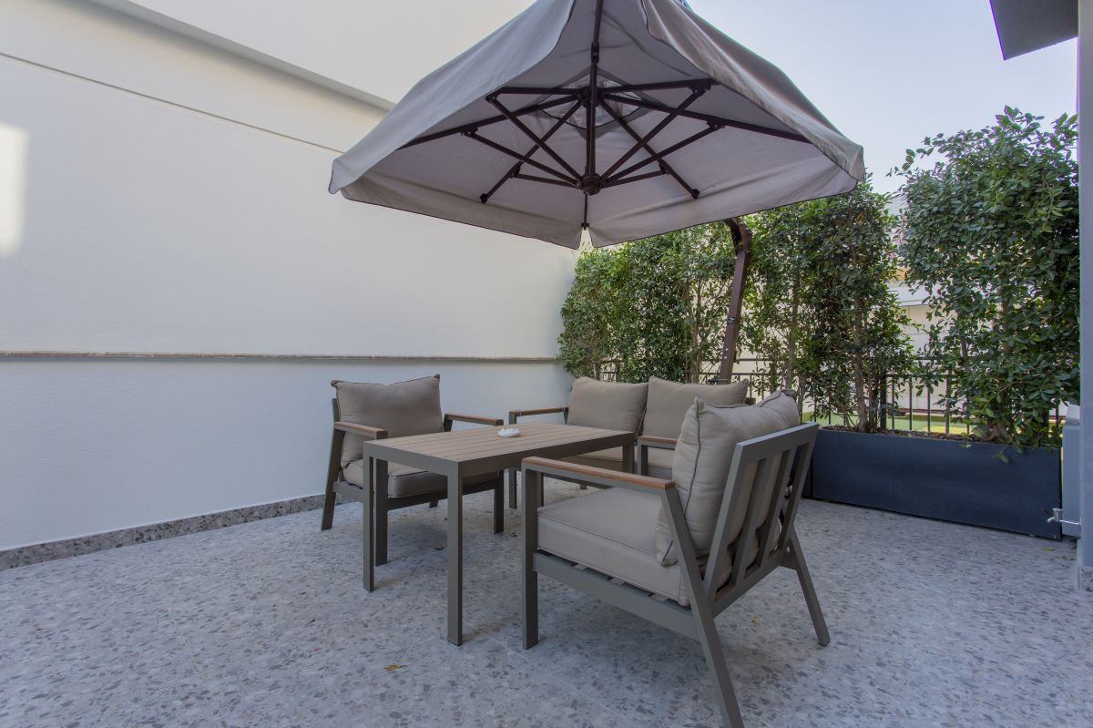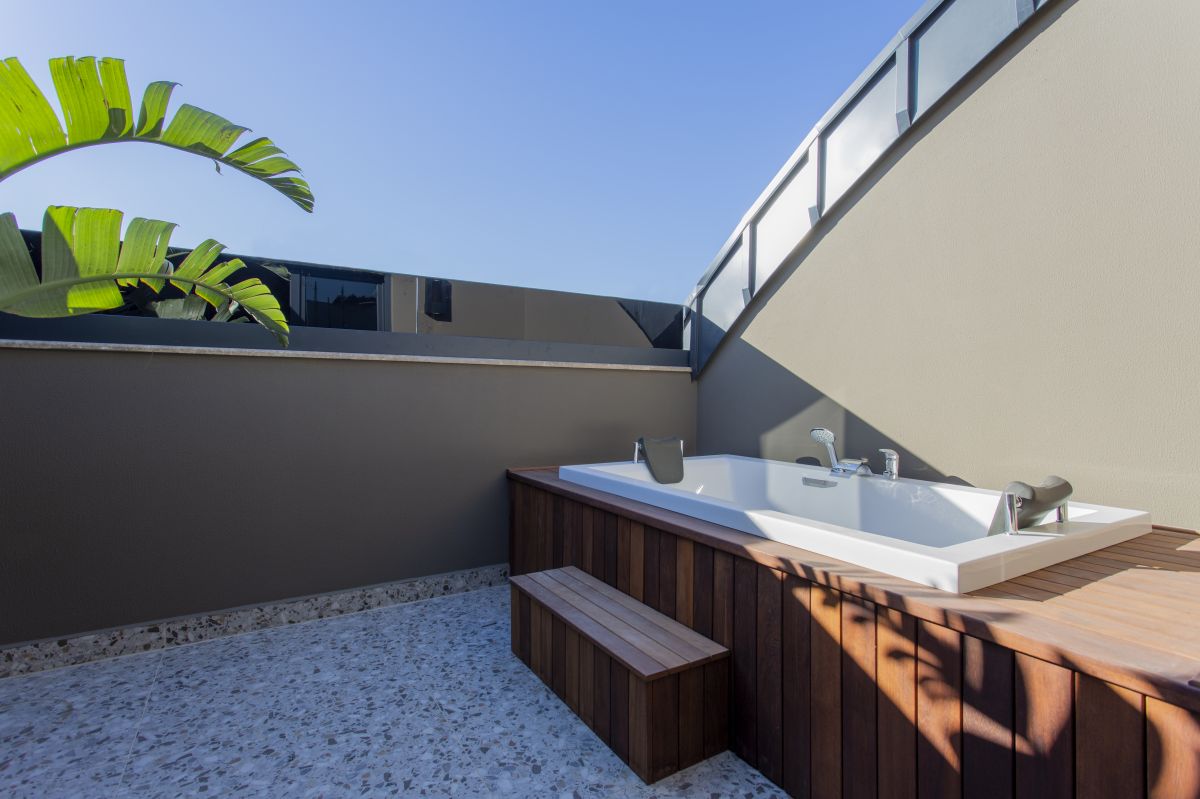 Просторная терраса внутреннего дворика с зоной барбекю и частным бассейном